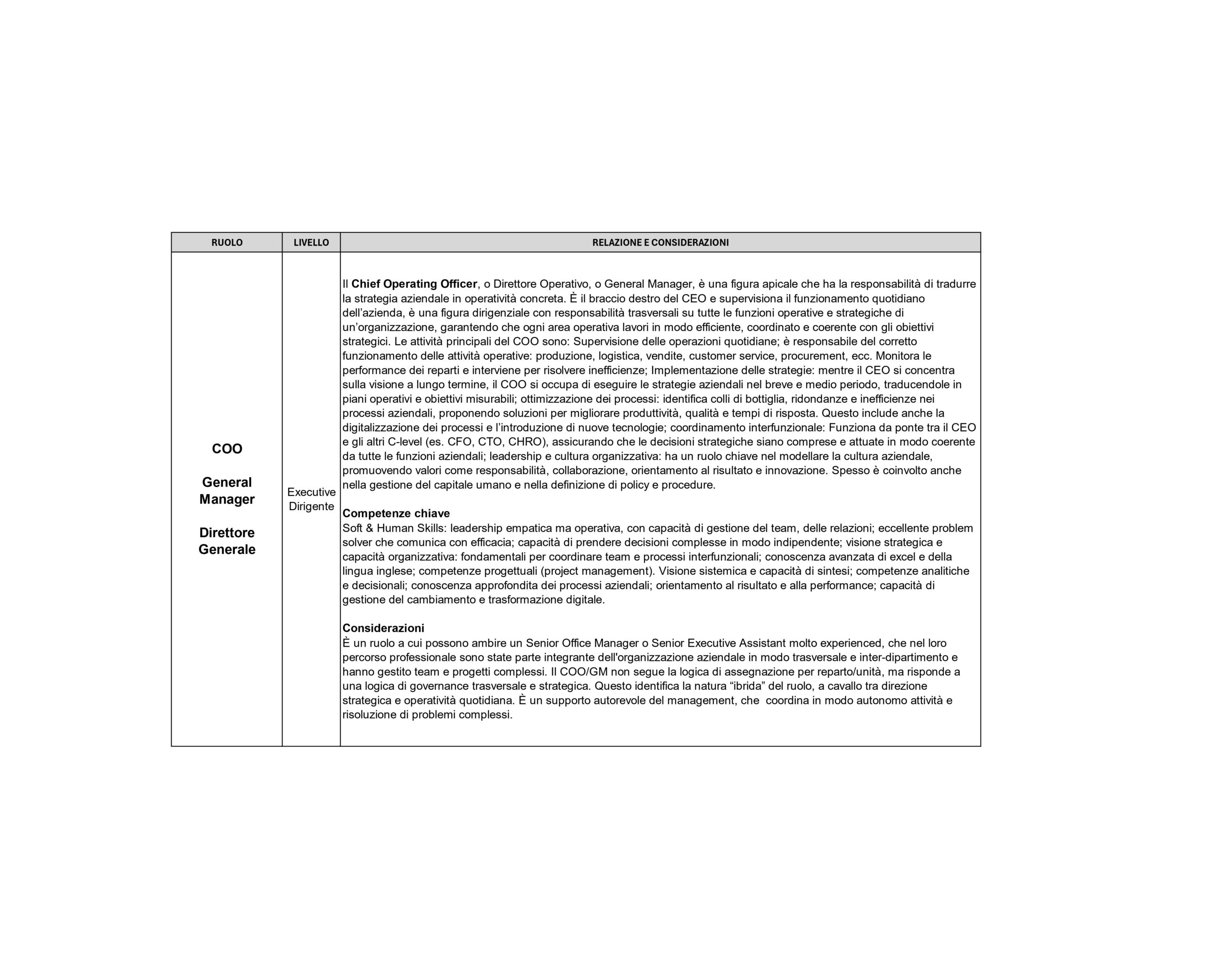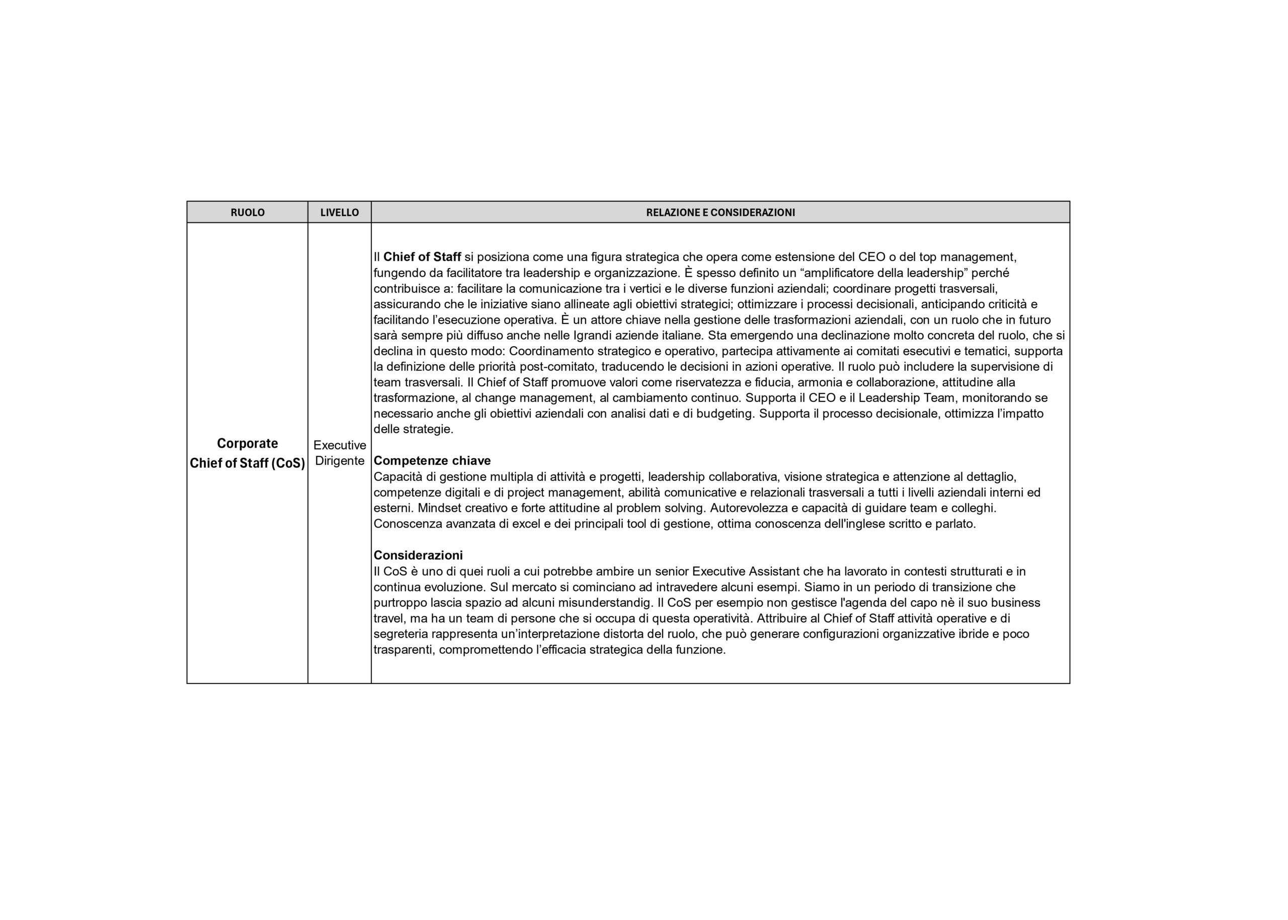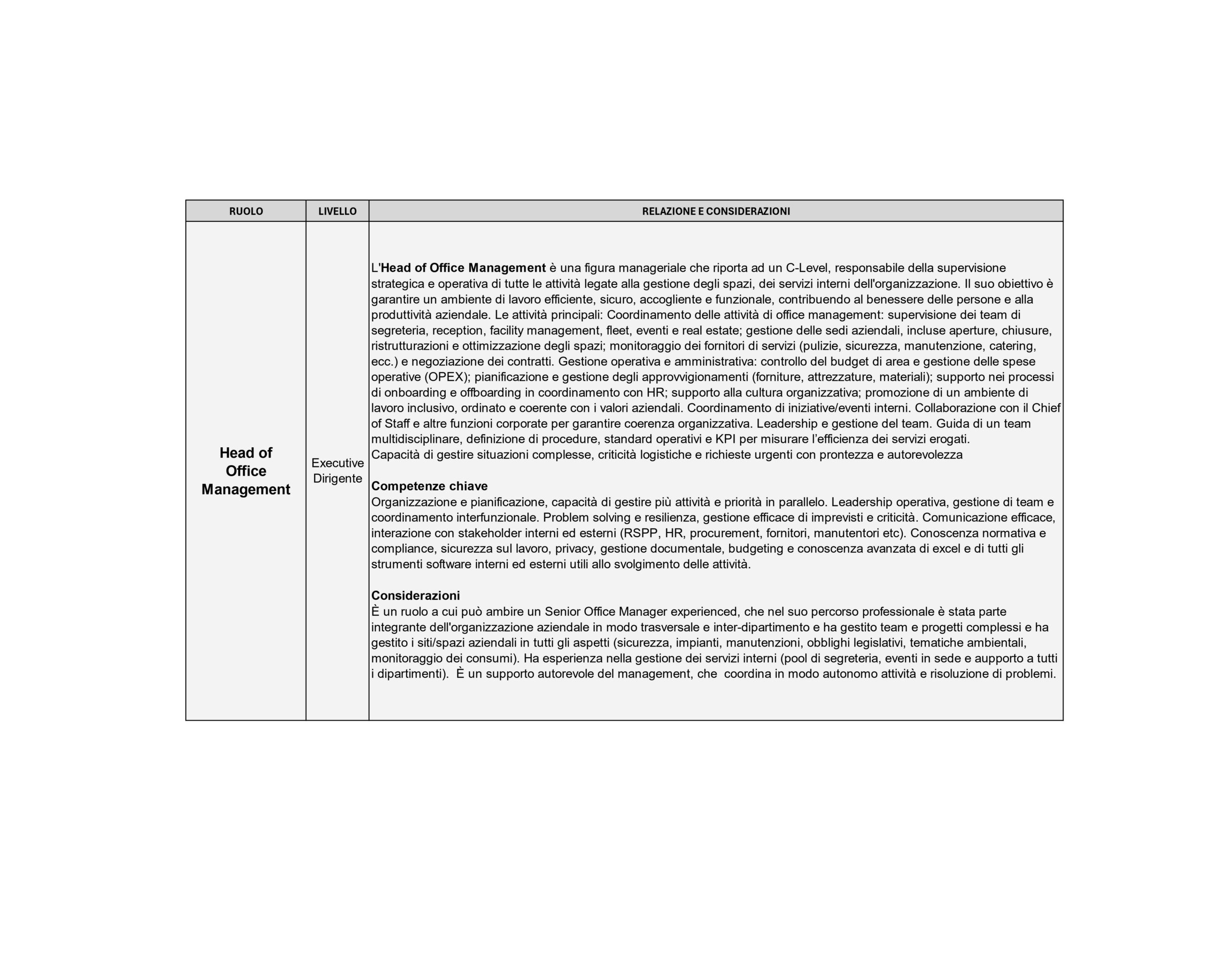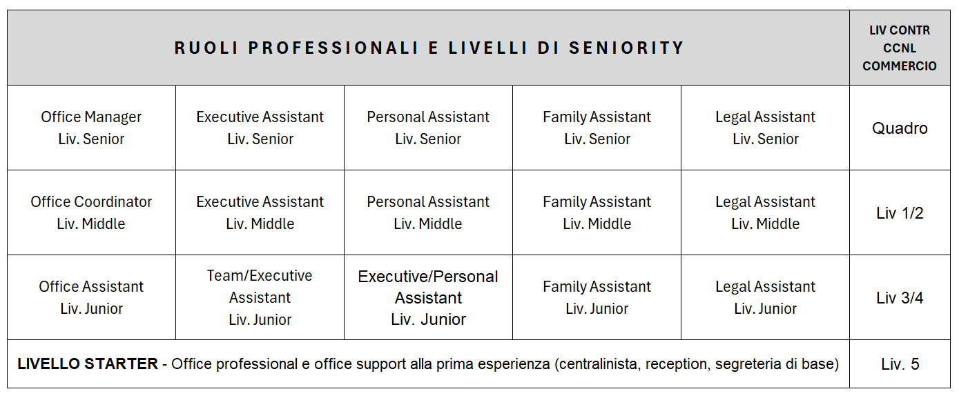 Il lavoro condotto da Unassyst, in sinergia con WeHunt e condivisa con gli HR Manager coinvolti, propone una visione autorevole e aggiornata del contesto attuale. Il risultato è una griglia dettagliata, strutturata e semplificata di Job Title, mappatura di attività, competenze e possibili sbocchi verso ruoli executive, pensata per supportare la crescita e il riconoscimento degli office professionals. I ruoli Executive individuati non costituiscono un passaggio scontato o automatico, ma devono essere supportati da un percorso professionale coerente con le responsabilità e le competenze richieste nel ruolo, e rafforzato da interventi formativi mirati e allineati alle esigenze di ogni specifico contesto organizzativo (es. Executive Master o altri strumenti di sviluppo avanzato).